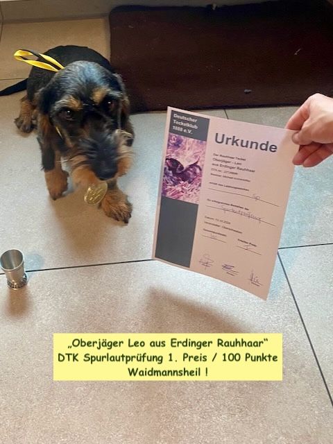 "Oberjäger Leo" hat die DTK Schweißprüfung am 14.09.24 mit 100 Punkten 1. Preis bestanden. Waidmannsheil !